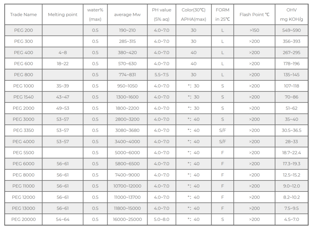 PEG-1000 a PEG-4000: Peso molecular médio, sólidos cerosos. À medida que o peso molecular aumenta, também aumentam a viscosidade e o ponto de fusão. Por exemplo, o PEG-3350 é um supositório e base de pomada comumente usado em produtos farmacêuticos, oferecendo boa formabilidade e desempenho de liberação de medicamentos.